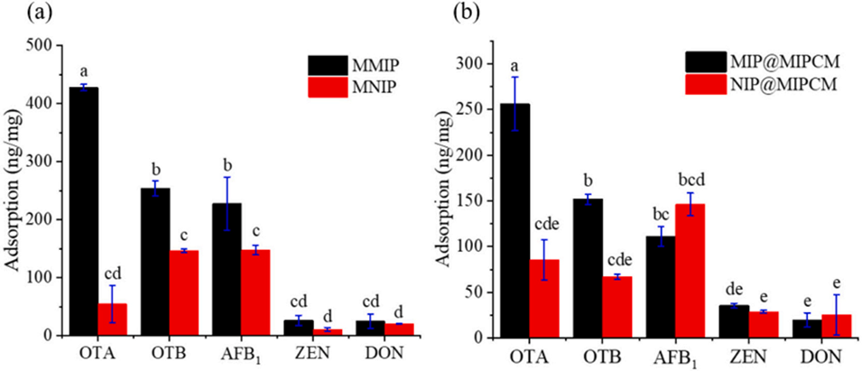 图7:MMIPs与MNIPs(a)、MIP@MIPCMs与NIP@MIPCMs(b)对各测试分子的吸附量(溶剂:乙醇;聚合物浓度:2mg/mL;分子浓度:1000ng/mL)。不同小写字母表示差异具有统计学意义(P<0.05)