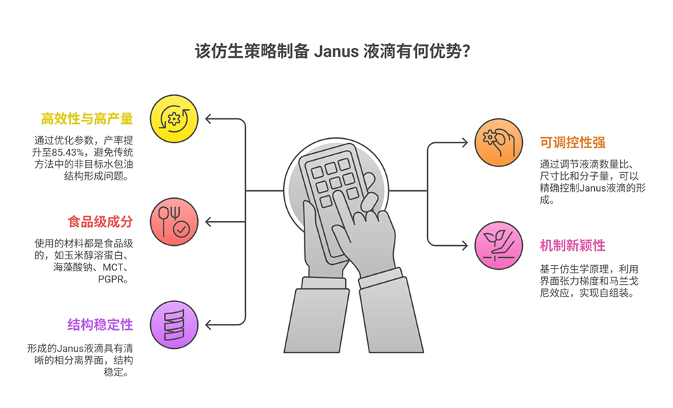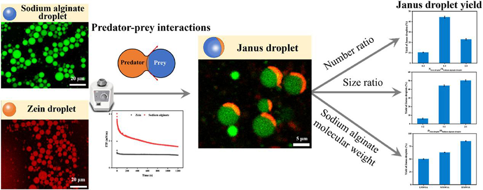 1、该研究受自然界捕食者-猎物关系启发,提出一种仿生策略,利用玉米醇溶蛋白(捕食者)与海藻酸钠(猎物)液滴的相互作用构建食品级Janus液滴,并通过调控液滴物理参数优化其产率。