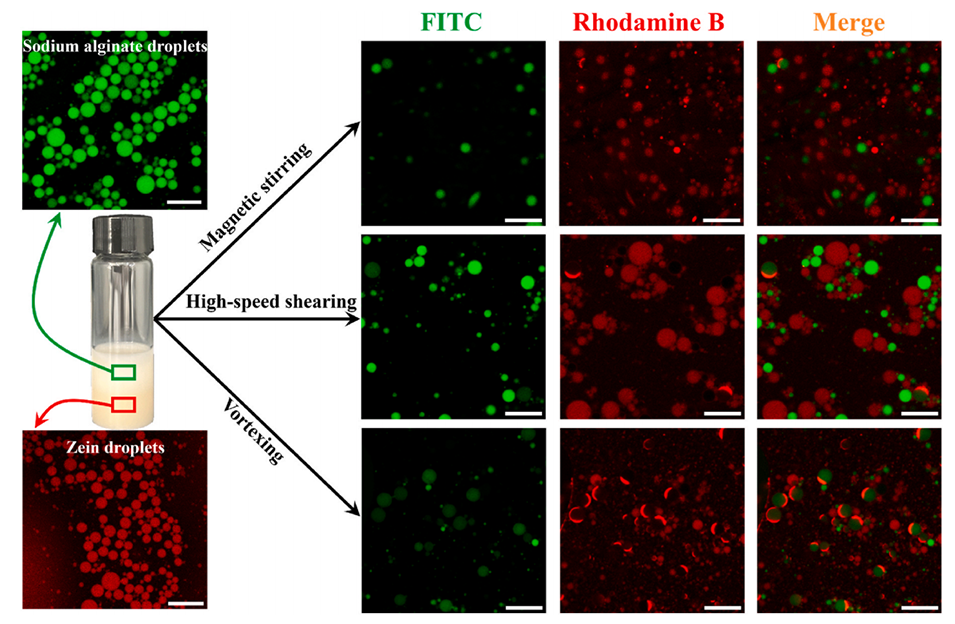 图4. 不同混合处理后玉米醇溶蛋白液滴与海藻酸钠液滴的共聚焦荧光显微镜图像(比例尺 = 20 μm)。