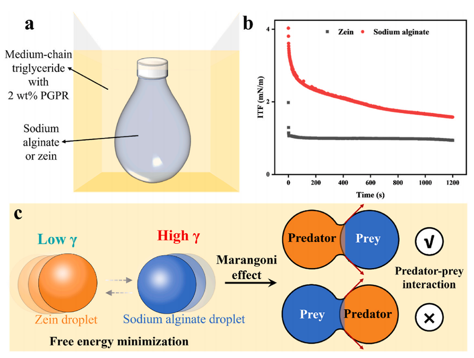 图1. a) 悬滴法测定界面张力的示意图;b) 玉米醇溶蛋白液滴与海藻酸钠液滴的界面张力变化;c) 玉米醇溶蛋白液滴与海藻酸钠液滴间捕食者-猎物相互作用的示意图。
