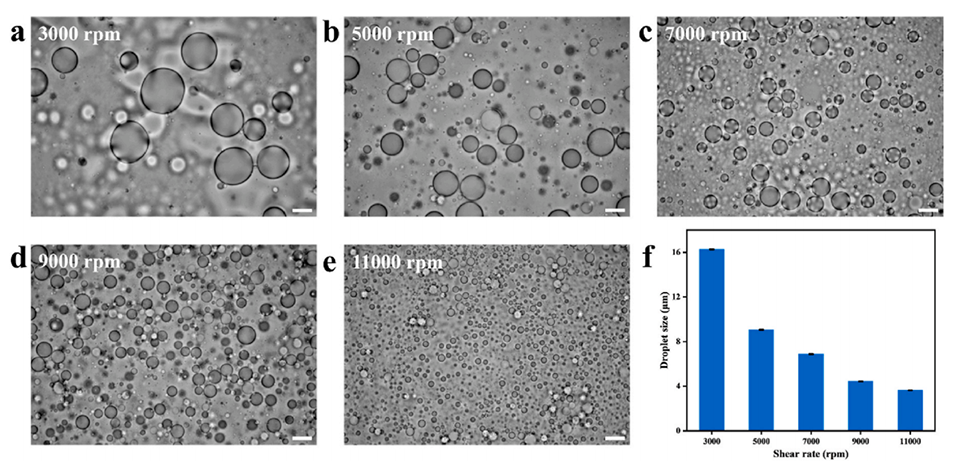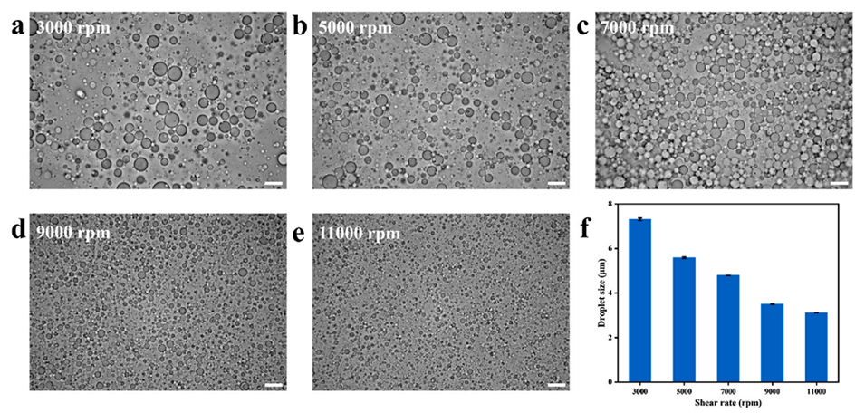 图3. 不同剪切速率下玉米醇溶蛋白液滴的光学显微镜图像:a) 3000 转/分钟、b) 5000 转/分钟、c) 7000 转/分钟、d) 9000 转/分钟、e) 11000 转/分钟(比例尺 = 10 μm);f) 玉米醇溶蛋白液滴的粒径统计。