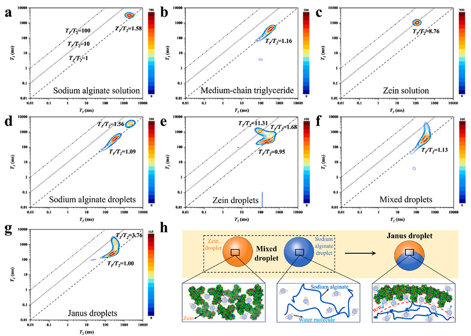 图6. 低场核磁共振之T1-T2二维图谱分析:a) 1.5 wt% 海藻酸钠溶液、b) 含 2.0 wt% 聚甘油蓖麻醇酸酯(PGPR)的中链甘油三酯(MCT)、c) 10.0 wt% 玉米醇溶蛋白溶液、d) 海藻酸钠液滴、e) 玉米醇溶蛋白液滴、f) 海藻酸钠与玉米醇溶蛋白液滴混合物、g) 海藻酸钠-玉米醇溶蛋白复合 Janus 液滴;h) 海藻酸钠液滴与玉米醇溶蛋白液滴碰撞形成 Janus 液滴过程中的水分子迁移示意图。