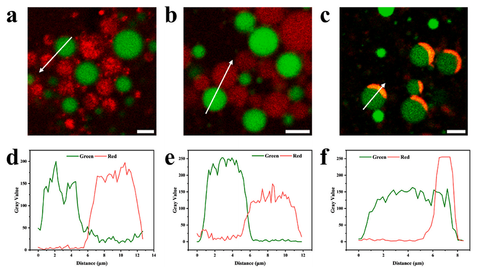 图5. 不同混合方式对海藻酸钠液滴与玉米醇溶蛋白液滴状态的影响:a) 磁力搅拌、b) 高速剪切、c) 涡旋混合(比例尺 = 5 μm);d–f) 图中箭头所示路径的荧光强度变化(玉米醇溶蛋白液滴染色为红色,海藻酸钠液滴染色为绿色)。