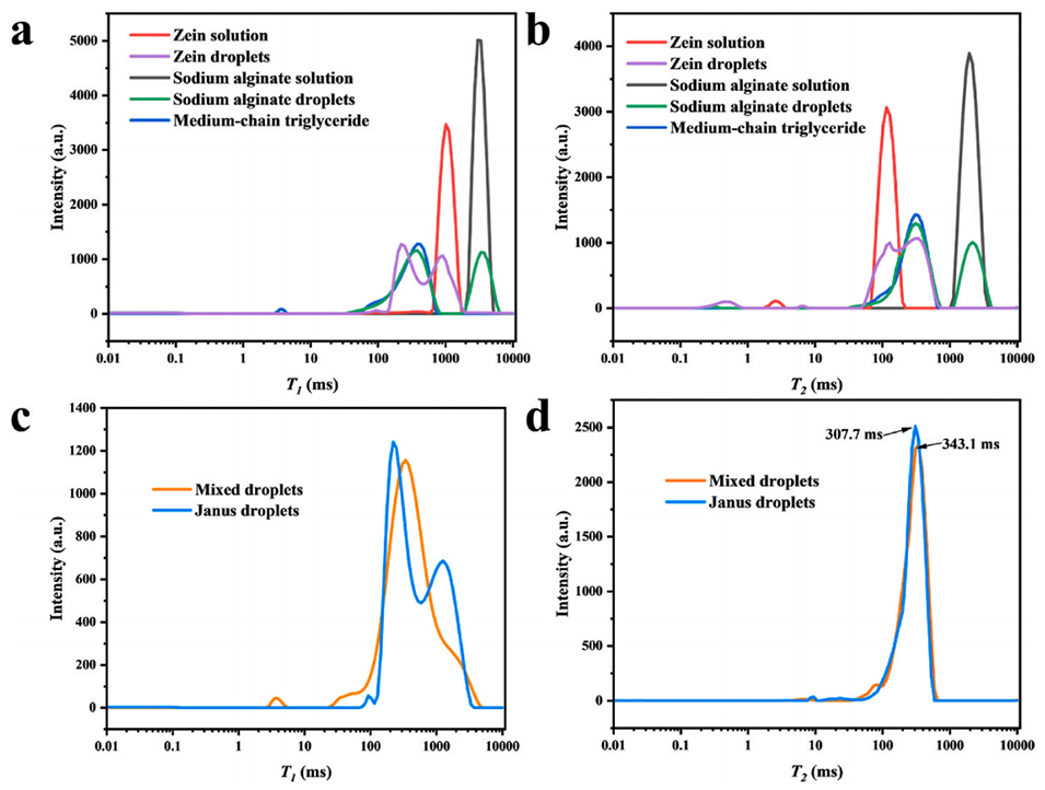 图7. 低场核磁共振一维图谱分析:a、c) 纵向弛豫时间(T1)曲线;b、d) 横向弛豫时间(T2)曲线(涉及样品:10.0 wt% 玉米醇溶蛋白溶液、玉米醇溶蛋白液滴、1.5 wt% 海藻酸钠溶液、海藻酸钠液滴、含 2.0 wt% PGPR 的 MCT、海藻酸钠与玉米醇溶蛋白液滴混合物、海藻酸钠-玉米醇溶蛋白复合 Janus 液滴)。