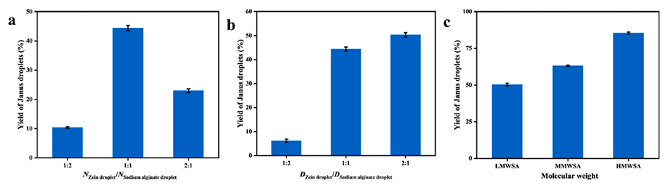 图9. 各关键参数对 Janus 液滴产率的影响:a) 玉米醇溶蛋白与海藻酸钠液滴的数量比;b) 玉米醇溶蛋白与海藻酸钠液滴的尺寸比;c) 海藻酸钠的分子量。