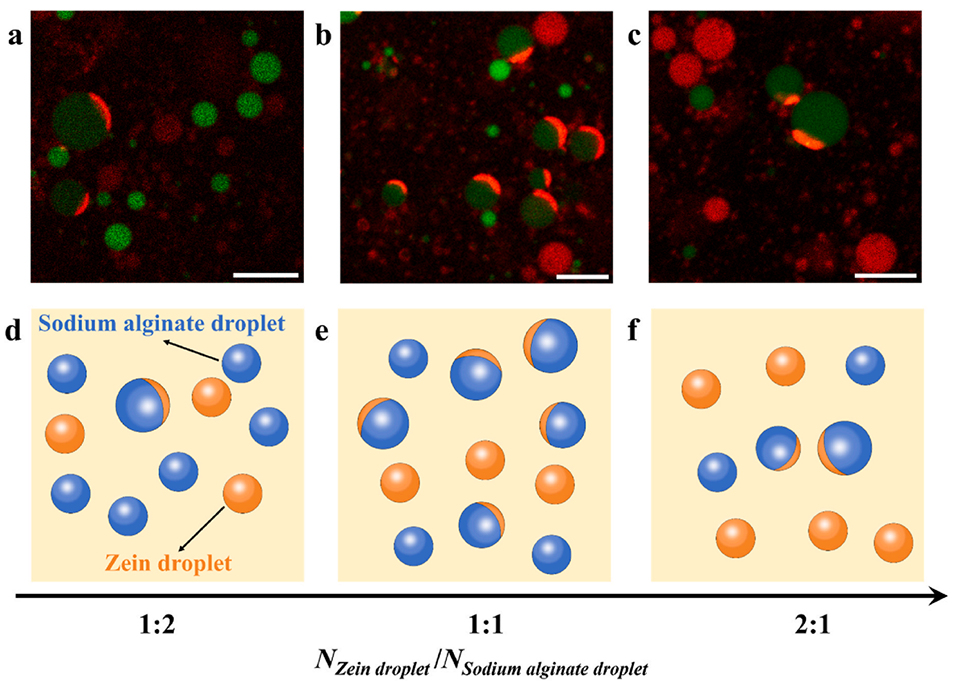 图8. 不同数量比(玉米醇溶蛋白液滴数/海藻酸钠液滴数 = 1:2、1:1、2:1)下的液滴共聚焦荧光显微镜图像(a–c)及示意图(d–f)(玉米醇溶蛋白液滴染色为红色,海藻酸钠液滴染色为绿色,比例尺 = 10 μm)。
