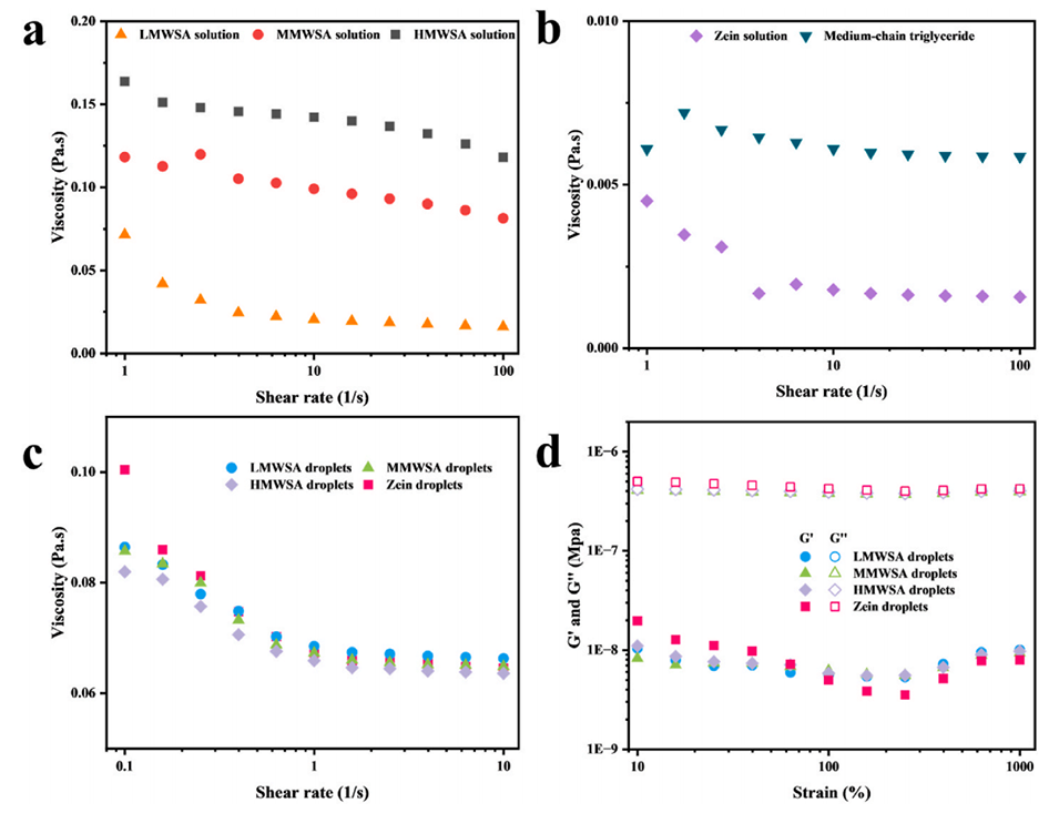 图10. 流变学分析:a–b) 不同溶液的表观粘度曲线;c) 不同液滴的表观粘度曲线;d) 不同液滴的应变扫描曲线(存储模量 G′与损耗模量 G″)。
