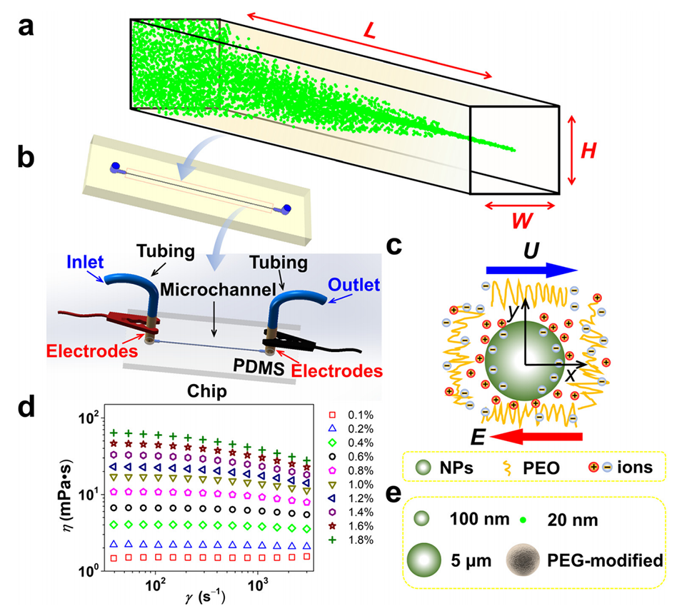 图1: 展示了微通道尺寸、微流控芯片设计以及用于纳米粒子(NP)操控的多物理场(电-弹性)控制系统示意图。(a) 微通道尺寸和NP聚焦示意图;(b) 集成外部直流电场的微流控芯片设计;(c) 在粘弹性流体和直流电场共同作用下,颗粒周围形成电双层(EDL)的示意图;(d) 不同浓度PEO溶液的实测剪切粘度;(e) 实验中使用的颗粒尺寸和类型。