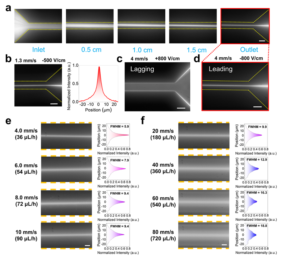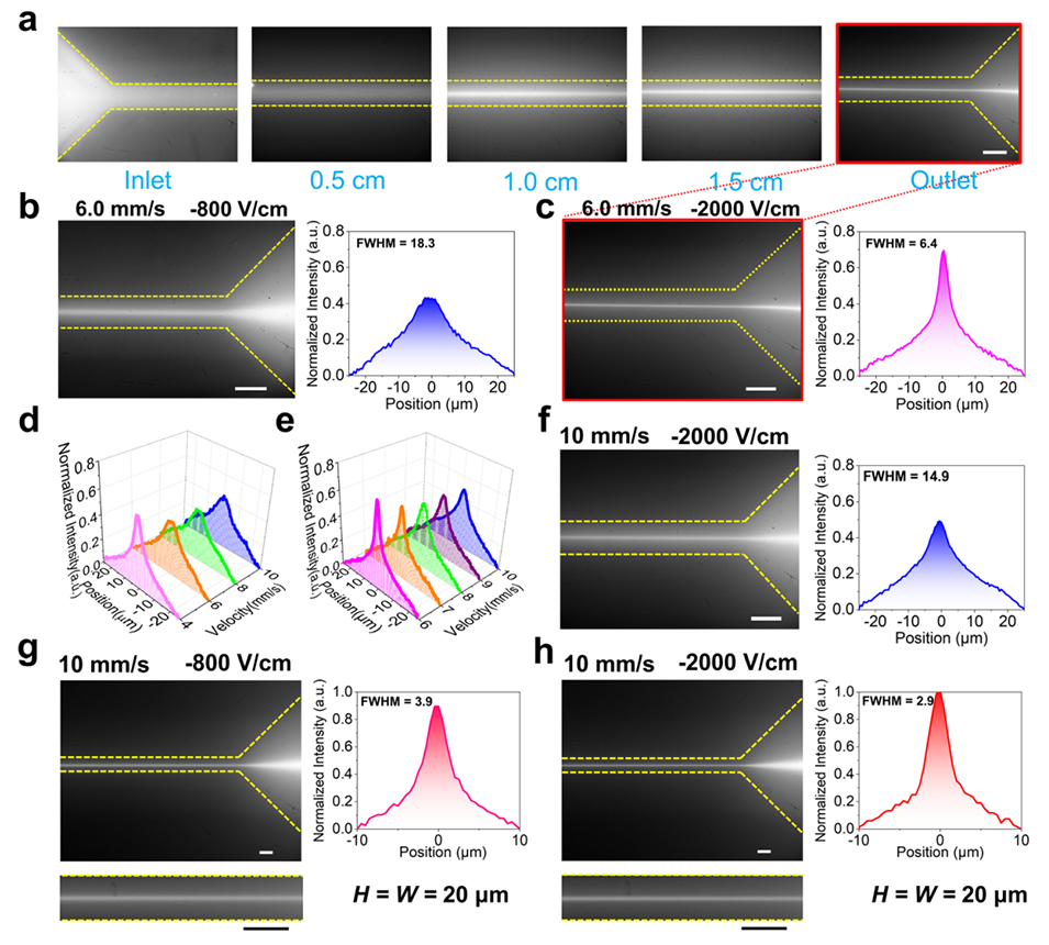 图2: 展示了在宽高均为50μm的直矩形微通道中,使用1.2% PEO溶液实现100纳米颗粒高通量聚焦的实验结果。包括在不同位置(入口、下游0.5cm、1cm、1.5cm及出口)的聚焦过程荧光轨迹,以及在低电场、低流速下的有效聚焦。对比了电场方向与流速同向和反向时颗粒的不同分布(聚集在侧壁或聚焦于中心),并量化了不同高流速下的聚焦效果(通过半高全宽FWHM衡量)。