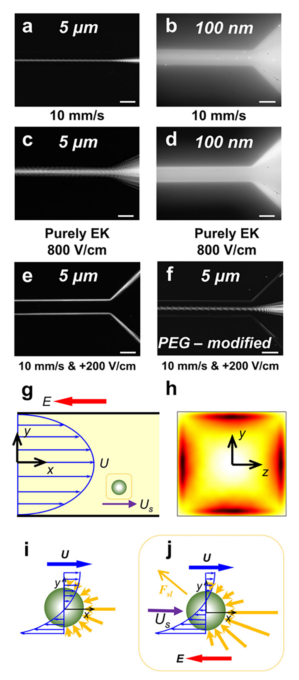 图3: 为理论分析部分,通过实验阐明了电-弹性聚焦的机制。比较了纯压力驱动流、纯电动流以及电-弹性耦合流中,5μm和100纳米颗粒的不同行为。使用PEG修饰的近电中性颗粒证明了滑移速度的关键作用。示意图解释了在非均匀剪切场中,滑移速度如何导致颗粒表面聚合物应力的不对称分布,从而产生侧向升力。