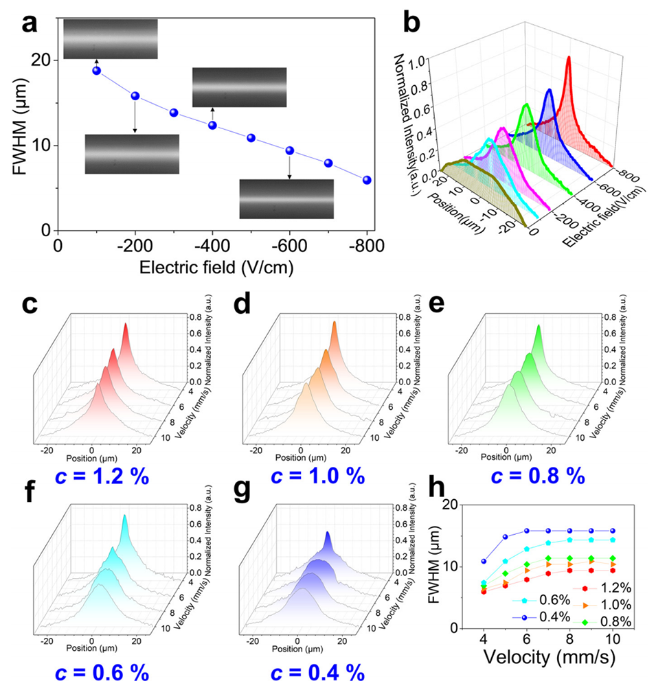 图4: 研究了电场强度、流速和PEO溶液浓度对100纳米颗粒聚焦性能的影响。通过FWHM和荧光强度分布曲线定量分析了这三个关键参数的影响。结果表明,在一定范围内,增加反向电场强度可改善聚焦;而流速过高或PEO浓度过低/过高都会导致聚焦效果下降,并确定了1.2% PEO浓度在此体系中的较优性。
