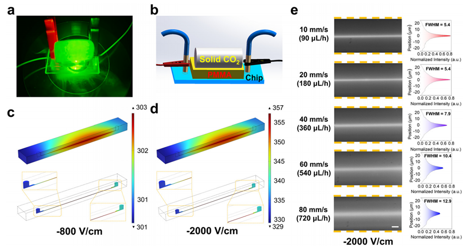 图5: 关于焦耳热效应的控制。(a) 使用干冰冷却微流控芯片的实际方法;(b) 温控时芯片的具体布置;(c, d) 模拟显示的在不同高强度电场(-800 V/cm 和 -2000 V/cm)下芯片内的温度分布,高电场导致显著温升;(e) 在-2000 V/cm高电场并控制温度下,100纳米颗粒在不同高流速下的高效聚焦结果,证明温控的有效性。