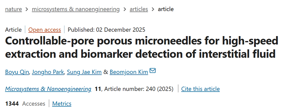 鉴于此,东京大学工学部研究人员提出了一种基于微流控技术制备单分散聚乳酸微球、经热键合工艺制造多孔微针的新方法。通过调控微球尺寸优化孔径、亲水性聚乙二醇(PEG)表面处理提升亲水性,同时优化键合条件平衡孔隙率与机械强度,最终实现了迄今最高的间质液体外提取速率,并成功集成于比色纸基传感器实现葡萄糖的精准检测。相关研究以“Controllable-pore porous microneedles for high-speed extraction and biomarker detection of interstitial fluid”为题目,发表在期刊《Microsystems & Nanoengineering》上。
