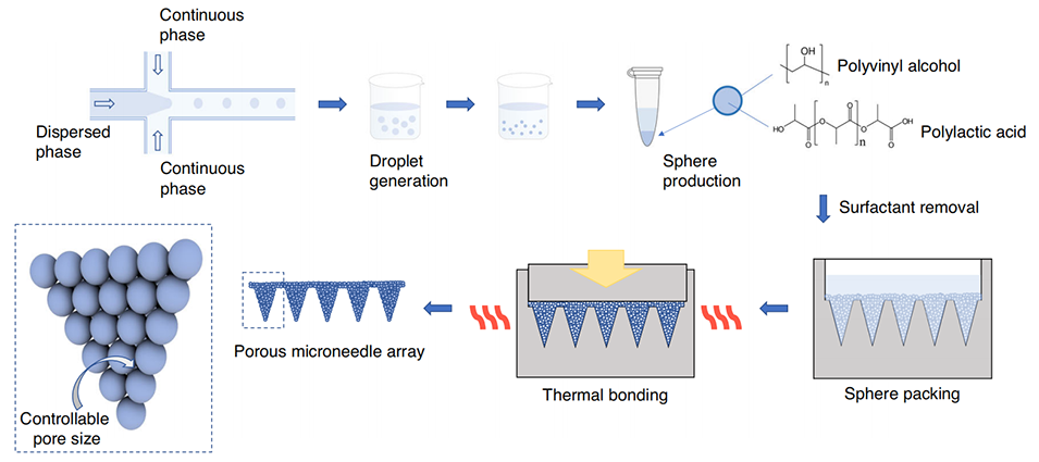 图1 基于微流控技术制备微球,并以此构建可控孔径多孔微针的流程示意图