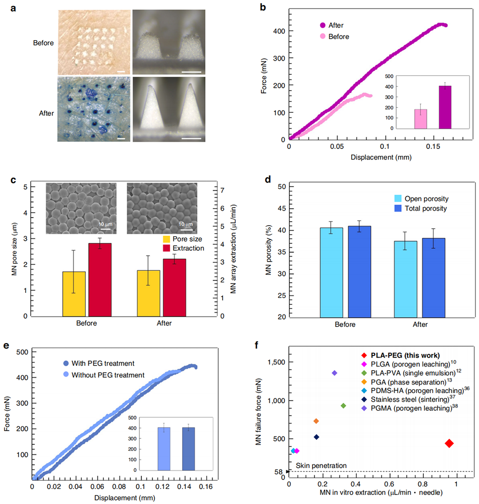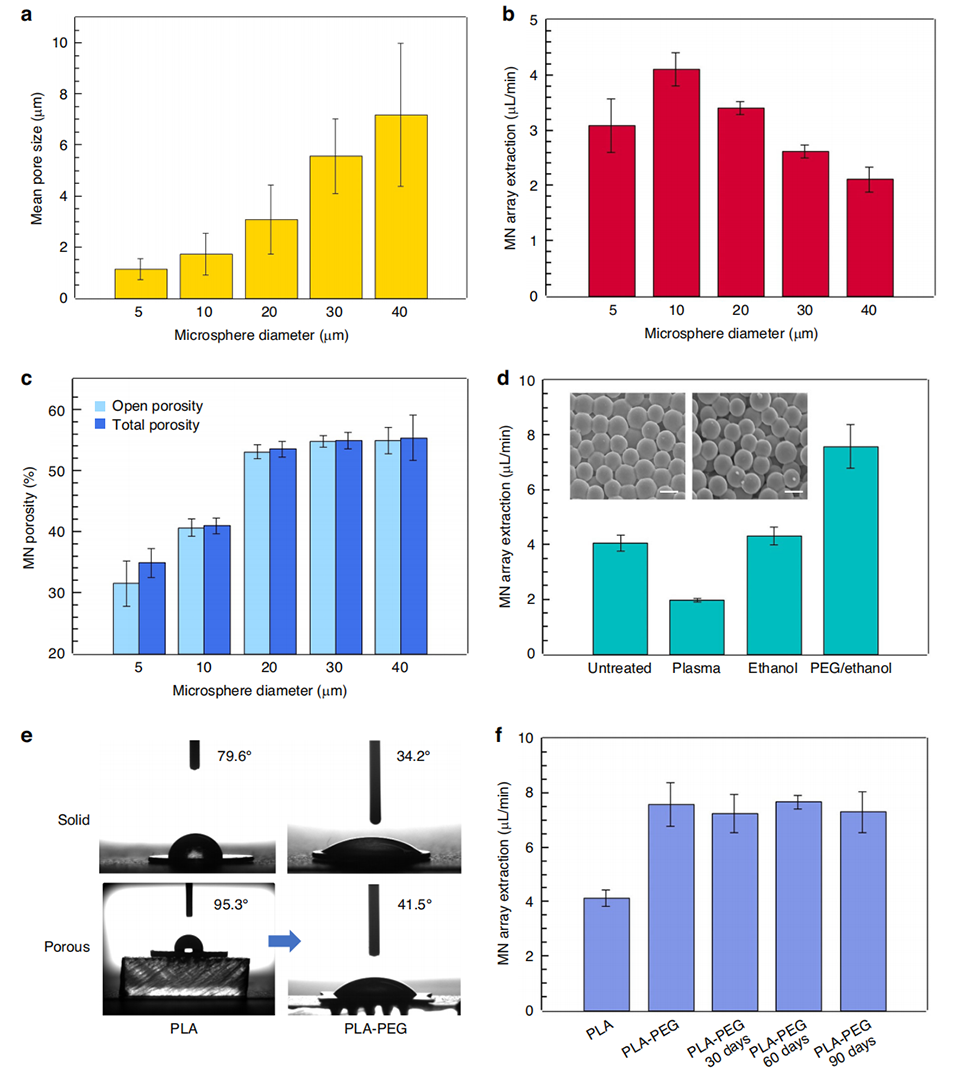 3、亲水性优化:采用PEG表面处理,将多孔PLA表面接触角从95.3°降至41.5°,显著提升毛细管力,最终实现0.95μL/min/针的迄今报道的最高提取速率。