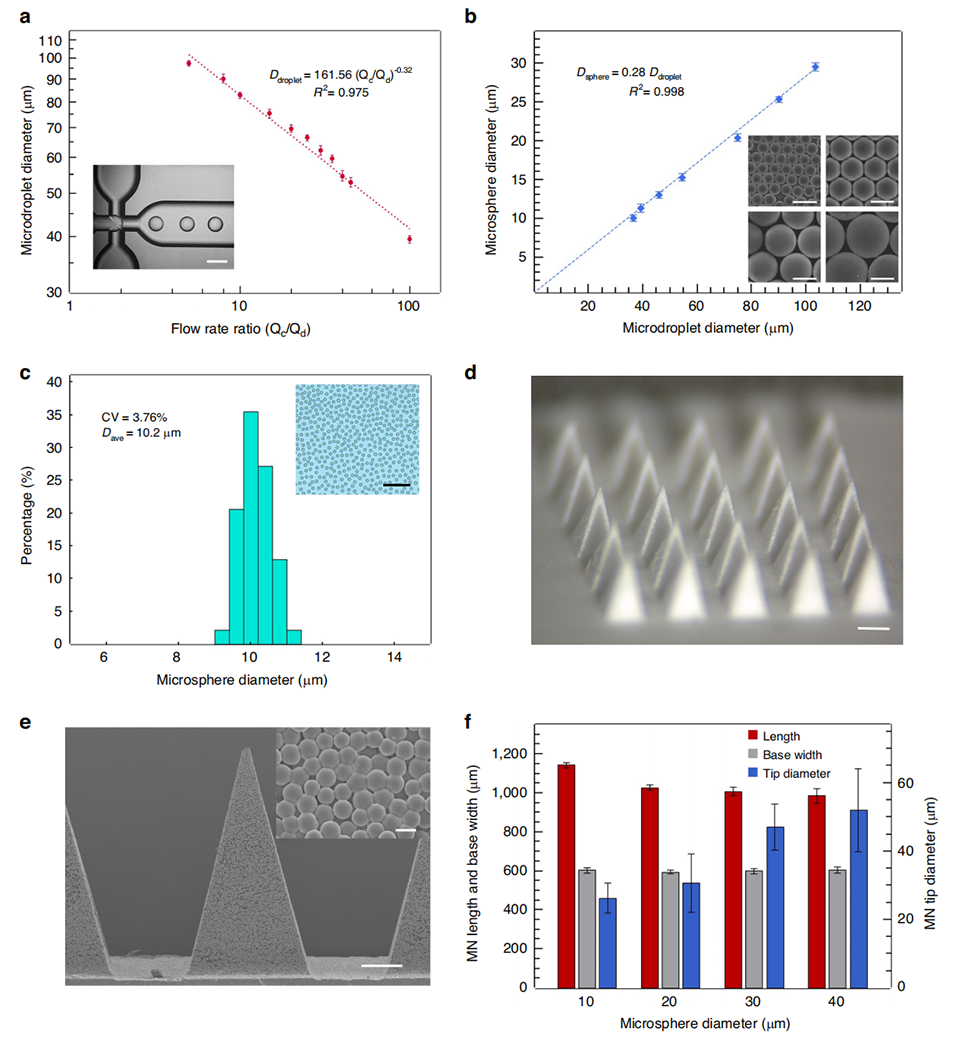 图2 可控尺寸微滴生成与微球制备用于多孔微针构建