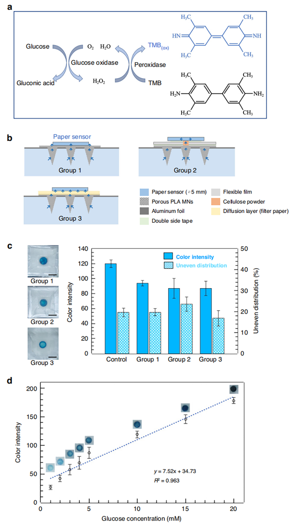 4、将多孔微针与扩散层键合,并集成到比色纸基传感器中,用于葡萄糖检测。在人工皮肤模型上的测试证实,葡萄糖浓度与纸基传感器的颜色变化呈线性相关。