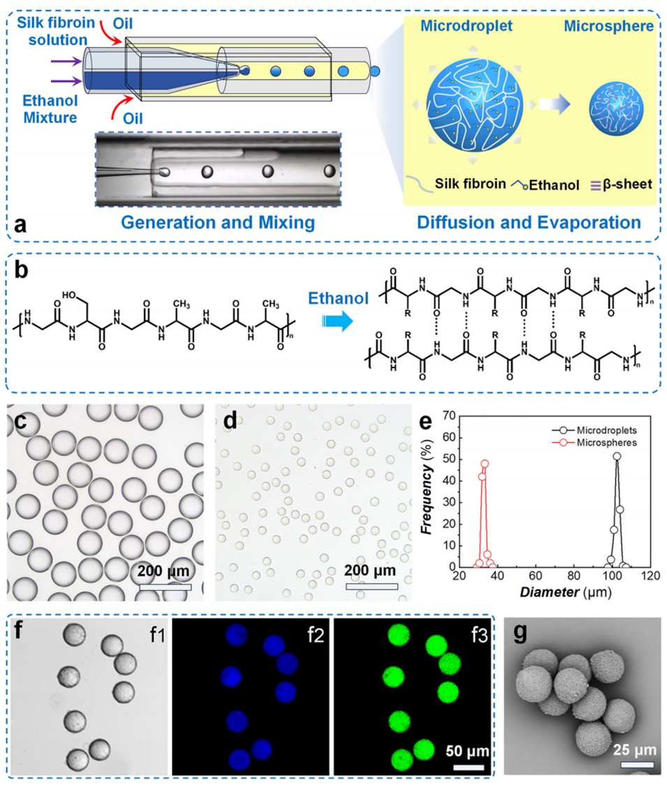 1、本文提出了一种可靠、简便的液滴微流控方法,基于可控的温度-乙醇介导凝胶化过程,实现了具有显著本征荧光的单分散丝素蛋白微球的快速、可控制备。