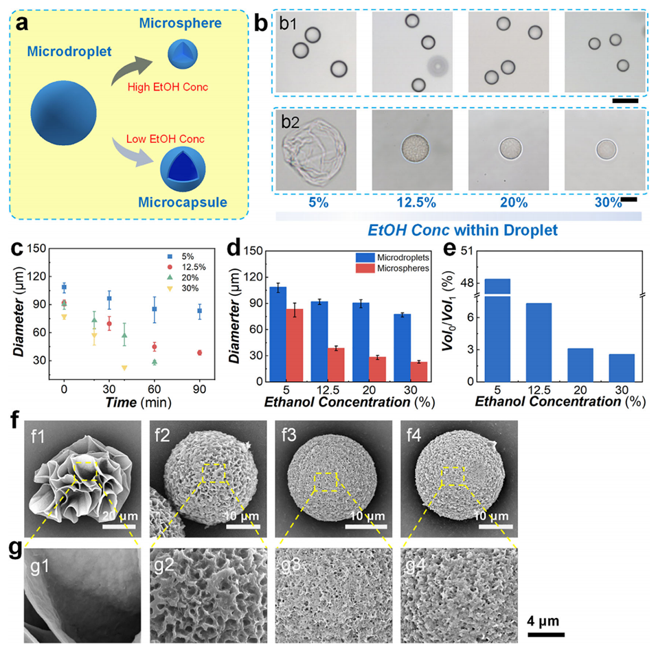 图3 通过改变含丝素蛋白微滴内的乙醇浓度实现丝素蛋白微球的可控制备