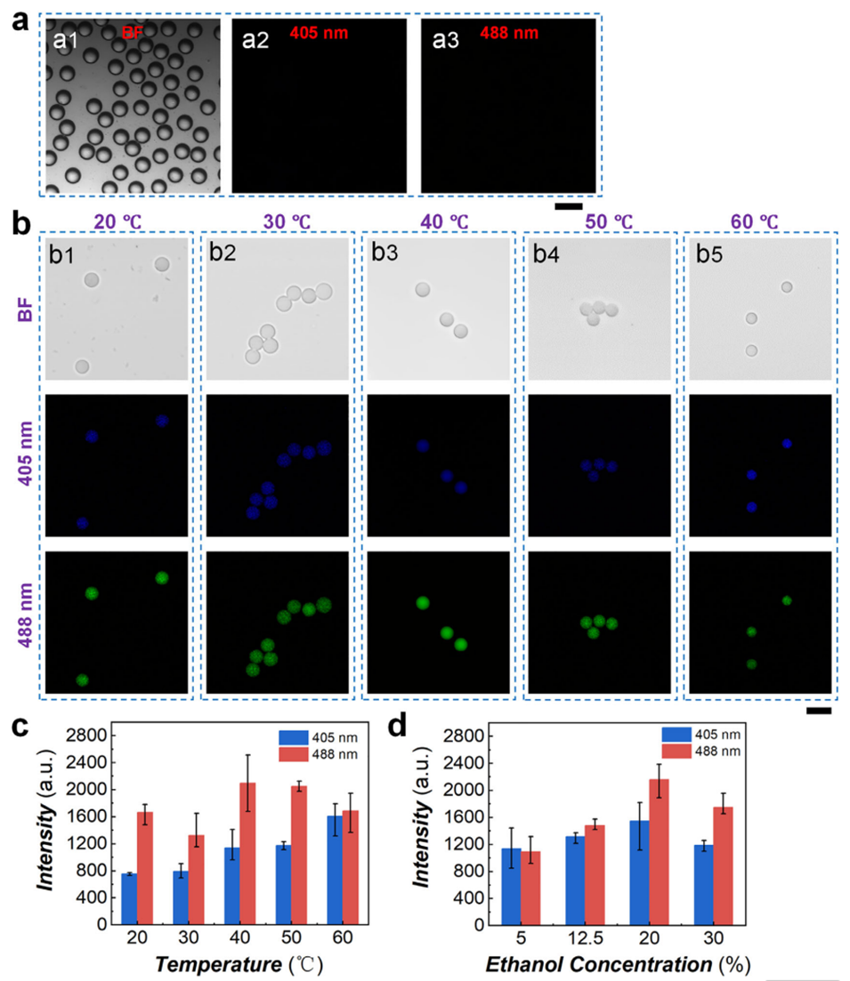 3、为验证该液滴微流控方法的有效性、快速性与可控性,系统探究了孵育温度和乙醇浓度对微球制备过程、尺寸、形貌及荧光性能的影响。值得注意的是,通过调控孵育温度,可在20分钟内快速制备出微球;而改变乙醇浓度则能得到实心或核壳结构等不同形貌的产物。
