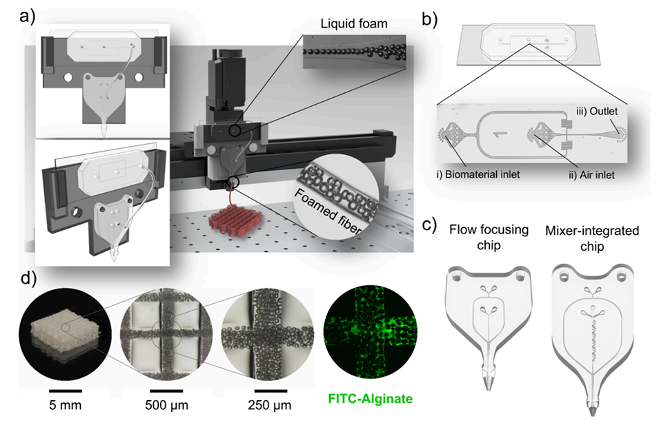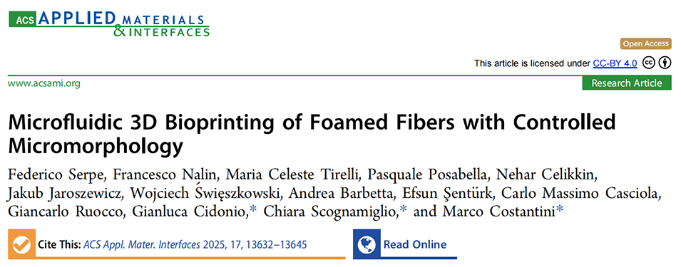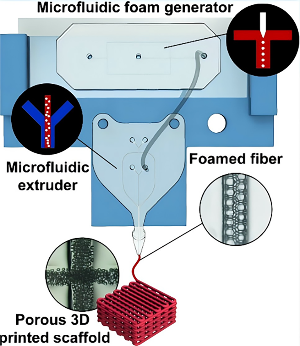 近日,波兰科学院物理化学研究所联合意大利技术研究院等单位提出一种融合微流控技术与3D生物打印的创新方法,通过串联的泡沫生成芯片与挤出芯片实时生成液体泡沫并同步诱导凝胶化,实现了对纤维内部气泡尺寸、孔隙率与空间分布的动态调控,从而一步制备出具有定制化孔隙梯度的载细胞多孔支架。相关研究以“Microfluidic 3D Bioprinting of Foamed Fibers with Controlled Micromorphology”为题目,发表于期刊《ACS Applied Materials & Interfaces》。
