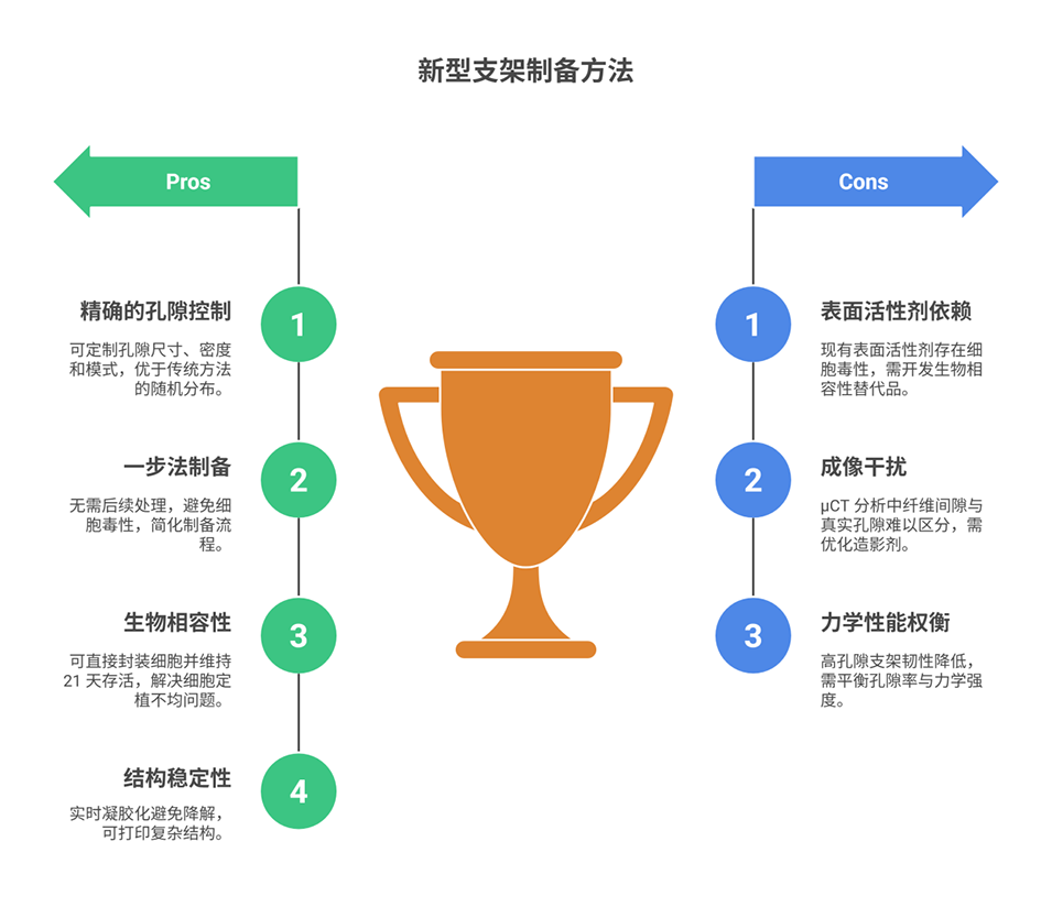 6、该技术无需有机溶剂,泡沫实时凝胶化保障结构稳定性,在骨组织修复、肿瘤模型构建等再生医学领域具有重要应用价值,但仍面临表面活性剂细胞毒性、μCT成像孔隙区分困难等挑战。