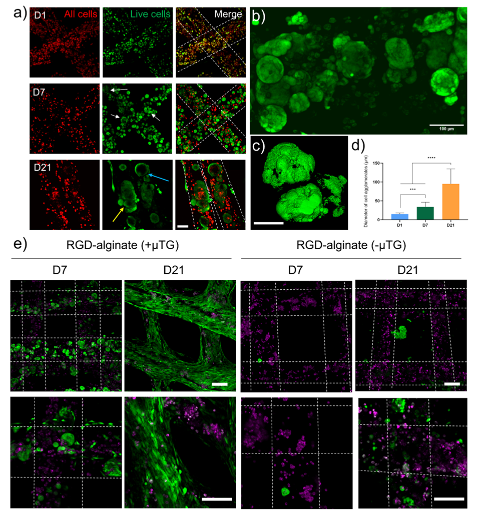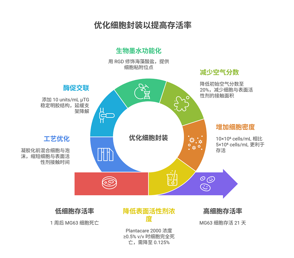 4、细胞实验表明,在最佳条件(10×10⁶ cells/mL细胞浓度、0.04%表面活性剂浓度、20%初始空气分数)下,细胞可在支架内存活21天并形成70-120 μm的聚集簇,RGD修饰与μTG交联能进一步优化细胞粘附与迁移性能。