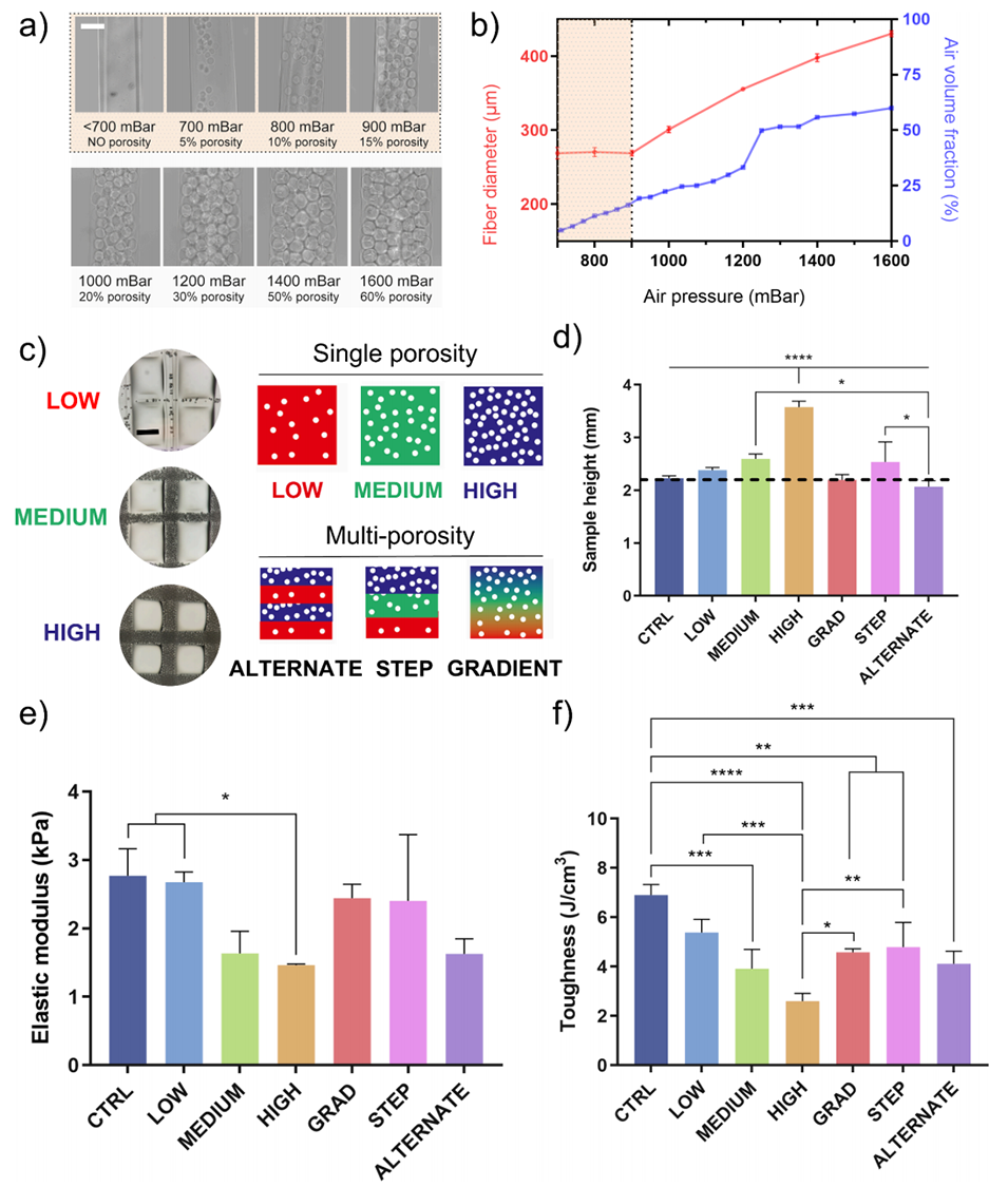 2、该方法能通过调控气压(700-1600 mbar)和生物墨水流速(25-40 μL/min),动态调节气泡尺寸(25-73 μm)、体积分数(最高74%)及孔隙模式(单孔隙、阶梯/交替/梯度多级孔隙),实现高空间精度的孔隙分布。