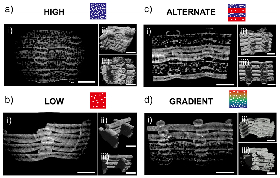 传统多孔支架制备技术难以精确调控孔隙结构与分布,无法仿生天然组织的复杂层级。3D打印为此提供了新途径,但现有生物打印策略或依赖有害组分,或无法在打印中实时调节孔隙,且细胞直接封装与长期存活仍是挑战。因此,开发一种能在线调控孔隙并高效载细胞的一体化打印方法,成为构建仿生梯度支架、推动组织工程发展的关键需求。