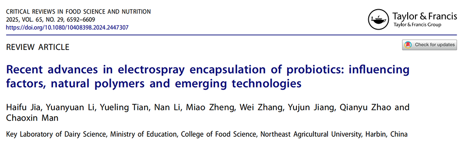 近期,东北农业大学食品科学学院满朝新教授、赵倩玉副教授等人发表综述,首先介绍了电喷雾原理与分类,分析了影响电喷雾微胶囊性能的相关因素,并总结了天然聚合物在电喷雾包封中的应用。此外,还探讨了该领域的最新进展,重点关注电喷雾设备的改进以及电喷雾与其他技术的融合。最后,指出了该领域当前存在的挑战,并展望了未来发展前景。相关研究成果以“Recent advances in electrospray encapsulation of probiotics: influencing factors, natural polymers and emerging technologies”为题目,发表在期刊《Critical Reviews in Food Science and Nutrition》上。