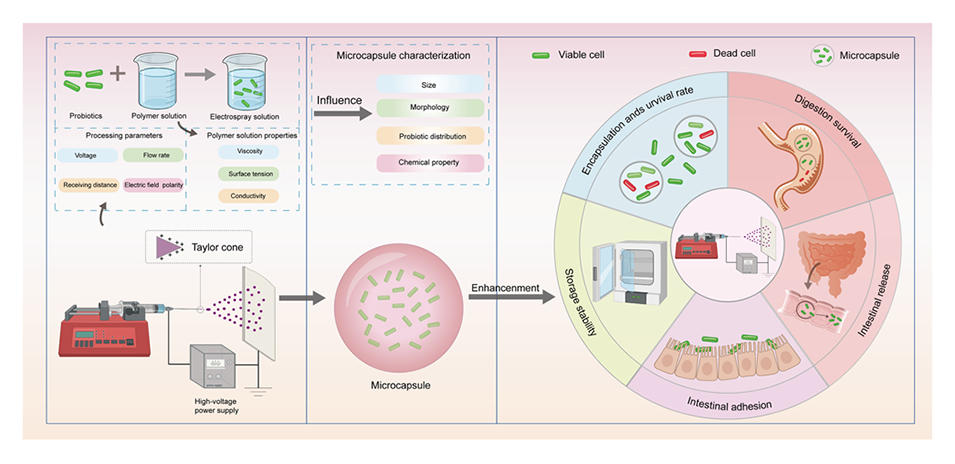 益生菌食品行业正随着消费者对营养补剂需求的增加而迅速发展,但益生菌在胃肠道恶劣条件下的存活仍然是一个主要挑战。益生菌包封技术虽被认为是提升其活性的有效解决方案,但大多数传统包封方法存在显著局限。电喷雾技术作为一种高效、灵活的新型封装方案,为解决这一难题提供了重要思路。