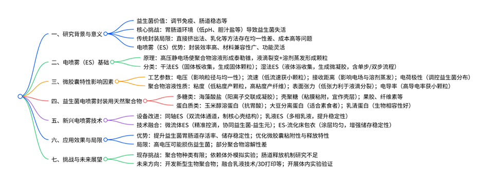 1、该综述聚焦益生菌电喷雾包封技术,围绕其原理、影响因素、应用材料、新兴技术及挑战展开。