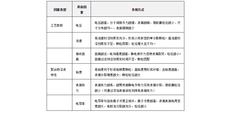 影响电喷雾微胶囊粒径和形态的核心因素包括工艺参数和聚合物溶液特性,具体作用如下: