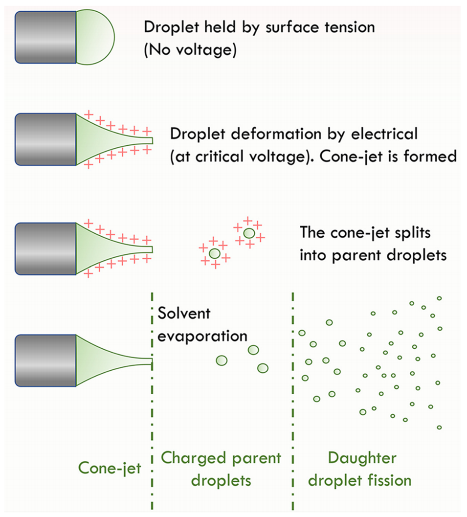 3、电喷雾技术基于带电液滴原理,分为干法和湿法(含单步、双步流程),其微胶囊的尺寸、形态等特性受电压、流速等工艺参数及聚合物溶液黏度、表面张力等性质影响。