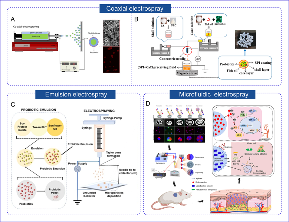 5、新兴技术方面,同轴电喷雾、乳液电喷雾等设备改进,以及电喷雾与微流控、流化床包衣等技术的融合,拓展了该技术的应用场景,提升了益生菌的存活率和稳定性。