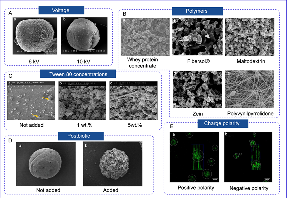 图7. 不同因素对电喷雾胶囊形态或益生菌分布的影响