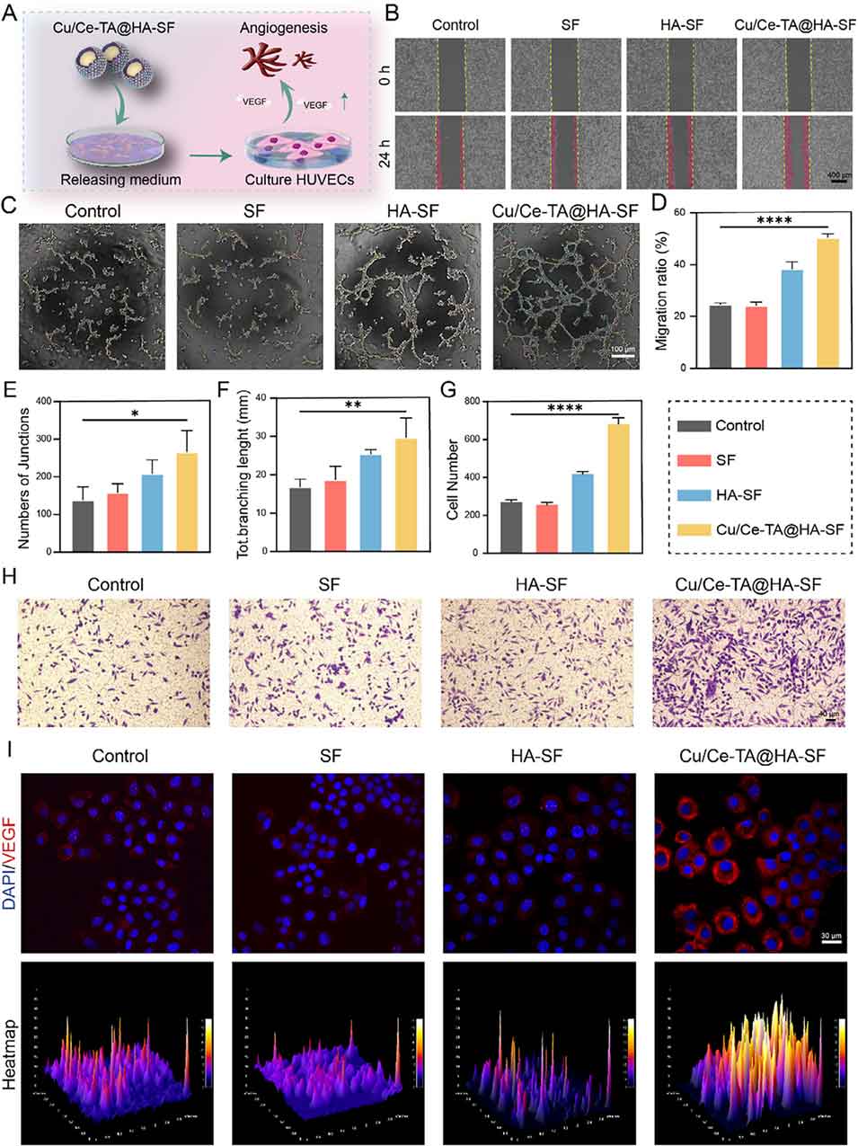 图10. 丝素蛋白(SF)、羟基磷灰石-丝素蛋白(HA-SF)及Cu/Ce-TA@HA-SF的体外血管生成活性