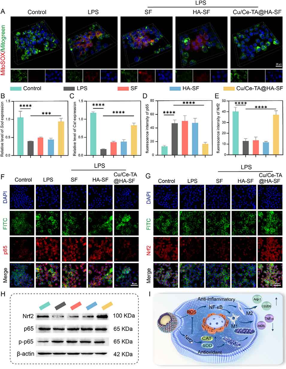 图9. Cu/Ce-TA@HA-SF通过调控Nrf2/NF-κB通路在体外发挥抗氧化及抗炎作用