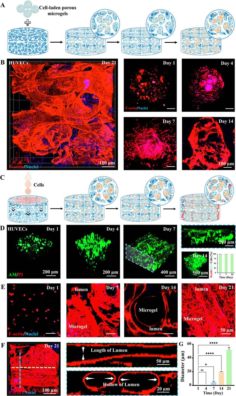 图7. 层级多孔水凝胶中的细胞行为及血管化