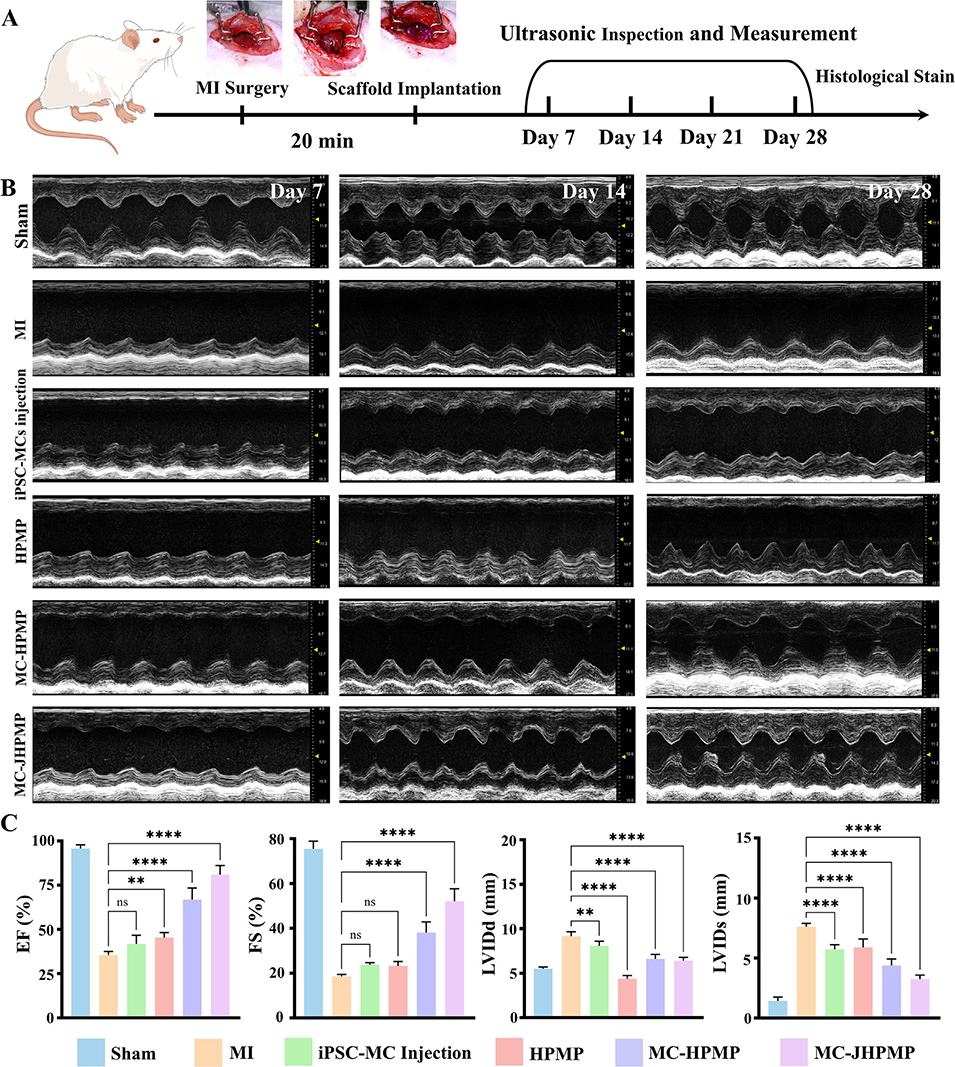 5、大鼠心梗模型验证显示,JHPMP可显著改善心脏功能(提高射血分数、缓解心室扩张),减少梗死面积和纤维化,促进血管新生及心肌细胞间缝隙连接形成,且无明显全身毒性。