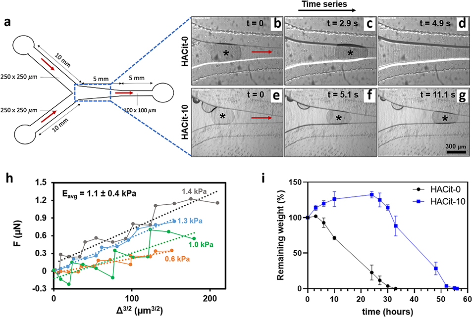 图4.(a)Y 形微通道设计示意图。(b-g)多次注射 0.2 mL HACit-0(b-d)或 HACit-10(e-g)后,微球在 Y 形 PDMS 微通道瓶颈处的动态变化时序图。红色箭头指示流动方向,星号标记微球位置。(h)HACit-10 微球的力-位移数据,每条实线代表一次实验,虚线旁数值为根据公式(3)计算的弹性模量 E。(i)HACit-0 和 HACit-10 微球在 7 U/mL 透明质酸酶作用下的体外降解行为。数据以 “平均值 ± 标准差” 表示,N=3。