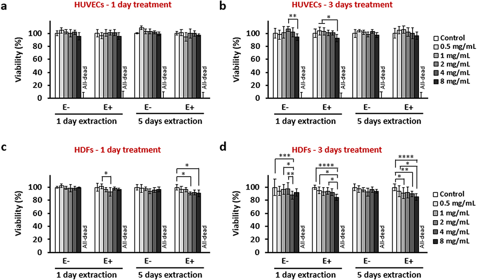 图5. 通过间接 MTT 法评估细胞存活率:人脐静脉内皮细胞(HUVECs)(a、b)和人真皮成纤维细胞(HDFs)(c、d)分别经浸提液处理 1 天(a、c)或 3 天(b、d)。浸提液制备方式为:将 HACit-10 微球按不同浓度(0.5、1、2、4、8 mg/mL,干重)在含或不含透明质酸酶(E + 表示含酶,E - 表示不含酶)的完全培养基中孵育 1 天或 5 天。阴性对照为未处理细胞(存活率 100%),阳性对照为经 20% 二甲基亚砜(DMSO)处理的细胞(全部死亡,存活率 0%)。数据以 “平均值 ± 标准差” 表示,N=6,*p<0.05,**p<0.01,***p<0.001,****p<0.0001。