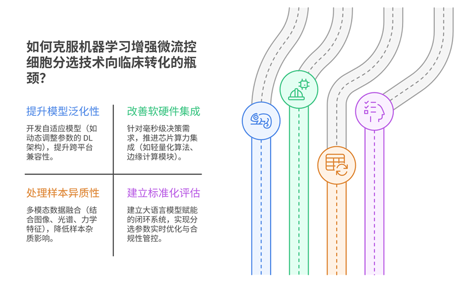 4、挑战与未来方向方面,当前存在模型泛化性不足、软硬件集成复杂等挑战,未来需推动微流控系统功能集成、机器学习算法创新,以及多模态数据融合,助力精准医疗和个性化治疗发展。