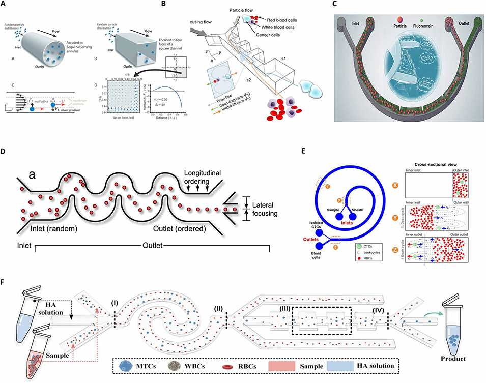 图4. 惯性微流控技术。(A)惯性微流控基本原理,突出颗粒聚焦和尺寸依赖性迁移特性。(B)低剪切应力下基于惯性微流控的血液中癌细胞分离。(C)基于带有序列微障碍物的半圆形微通道的高通量缓冲液交换系统。(D)用于提升颗粒聚焦和分离效率的蛇形惯性微流控通道。(E)用于高通量循环肿瘤细胞(CTCs)分离的迪安流分馏(DFF)技术示意图。(F)用于生物颗粒尺寸选择性分选的级联弹性-惯性细胞分离器件。