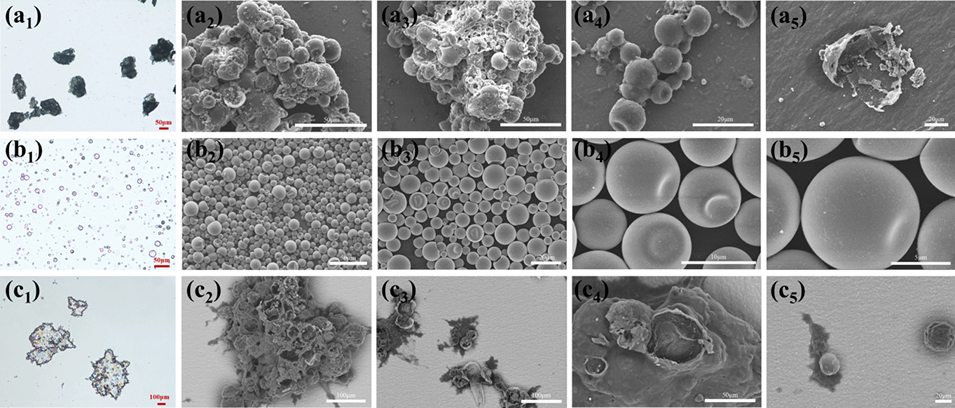 图4 不同乳液构型制备的相变微胶囊的光学显微镜照片(a₁至c₁)及扫描电子显微镜(SEM)形貌图(a₂-a₅至c₂-c₅)