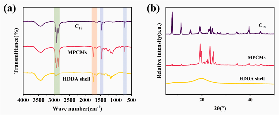 图6 C₁₈、HDDA壳层及相变微胶囊的傅里叶变换红外光谱(FTIR)图(a)和 X 射线衍射(XRD)图(b)