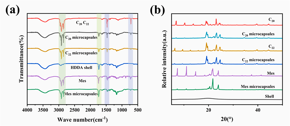 图9 Mes、C₂₀、C₂₂微胶囊的傅里叶变换红外光谱(FTIR)图(a)和 X 射线衍射(XRD)图(b)