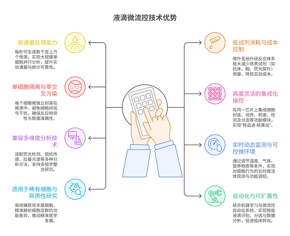 3、该技术在生物检测(如DNA编码库筛选、磷酸二酯酶活性鉴定)、免疫治疗(如单克隆抗体快速发现、抗原特异性细胞筛选)、药物筛选(如个性化肿瘤药物检测、多药组合筛选)中展现出显著优势,可提升实验效率、降低试剂消耗并实现单细胞水平的精准分析。