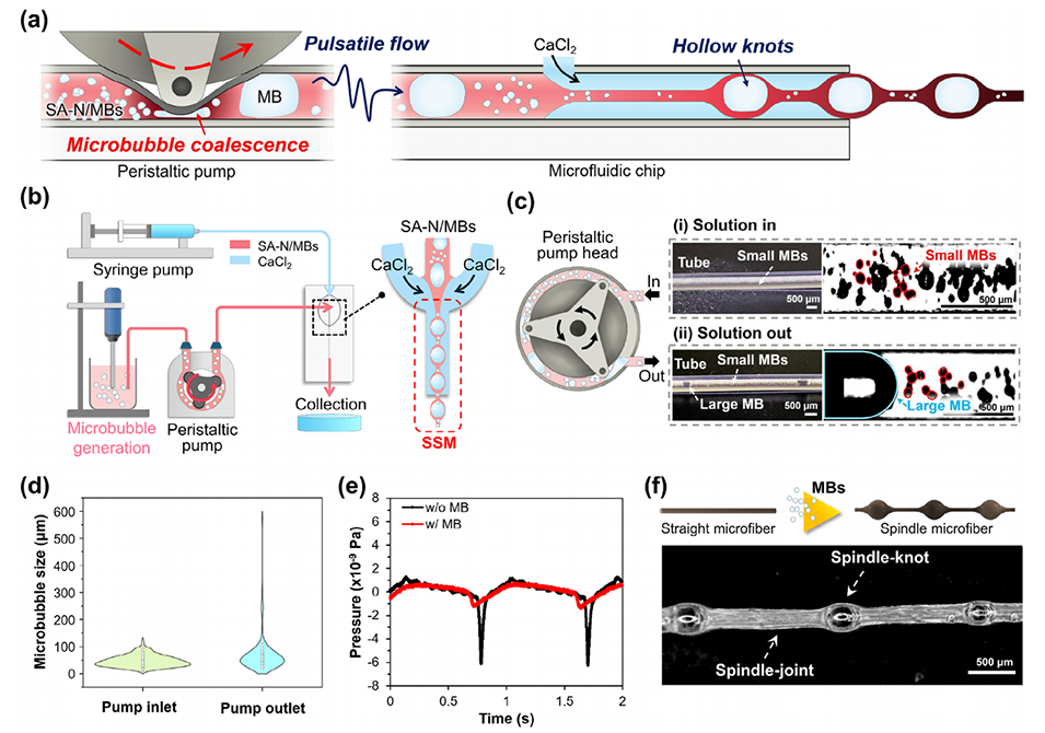 2、研究团队受蜘蛛丝启发,将微气泡与热响应性聚(N-异丙基丙烯酰胺)(PNIPAm)基材料结合,借助蠕动泵产生的脉动流促使微气泡聚并,成功制备出具有周期性结和连接结构的SSMs。