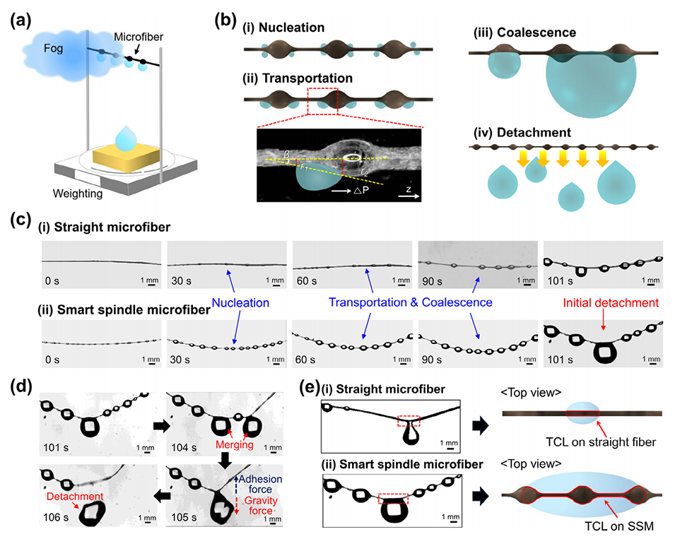 近期,韩国高丽大学研究团队提出一种微泡介导的微流控制备方法,利用蠕动泵产生的脉动流促使微泡聚并,结合热响应性聚(N-异丙基丙烯酰胺)(PNIPAm)基材料,成功制备出具有周期性纺锤结结构的智能纺锤微纤维(SSMs)。其独特的粗糙亲水表面与纺锤结-连接点结构延长了三相接触线、形成拉普拉斯压力梯度,配合PNIPAm的温敏润湿性调控,实现了0.046 g·min-1的雾水收集速率(为此前报道最高值的161%),且在温度循环中保持稳定性能,为干旱半干旱地区大规模雾水收集提供了高效解决方案。相关研究以“Microbubble‐Mediated Synthesis of Smart Spindle Microfibers for Fog Harvesting”为题目,发表在期刊《Small》上。